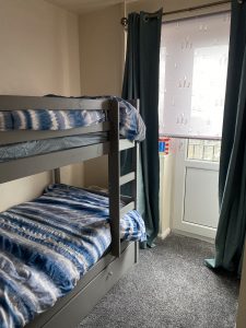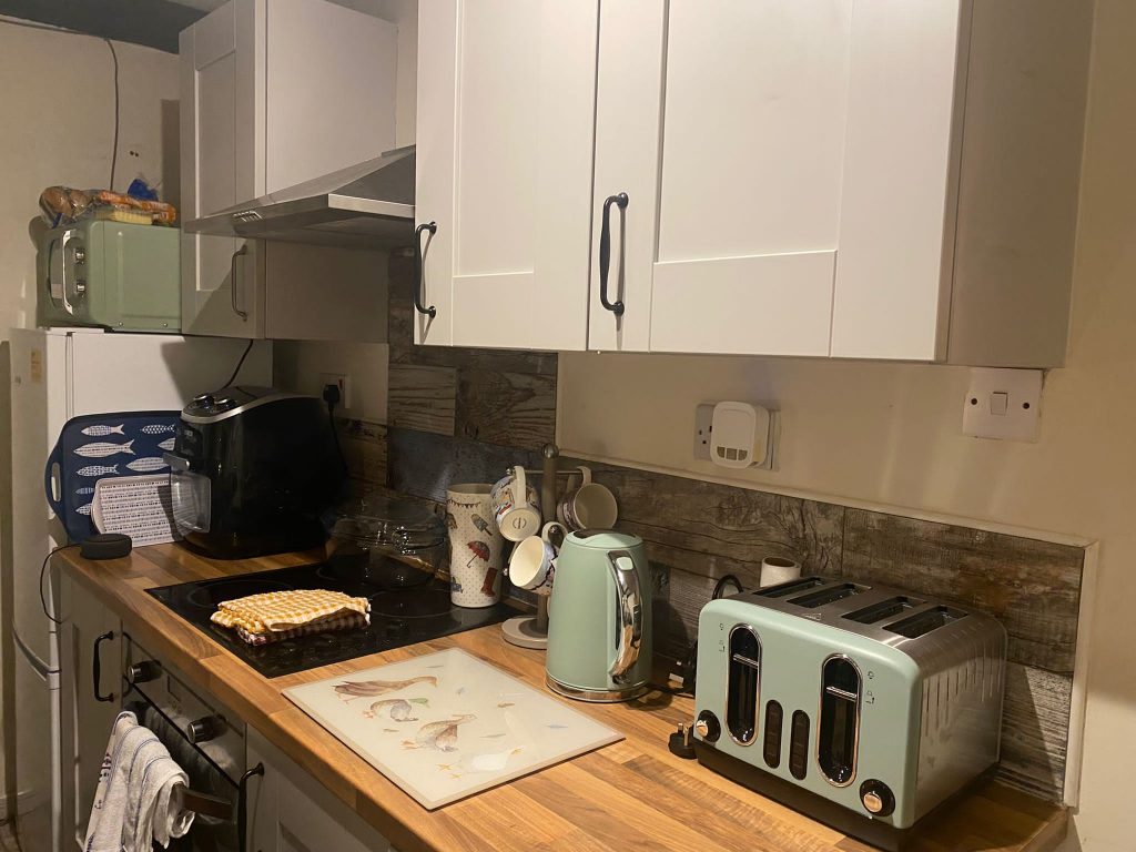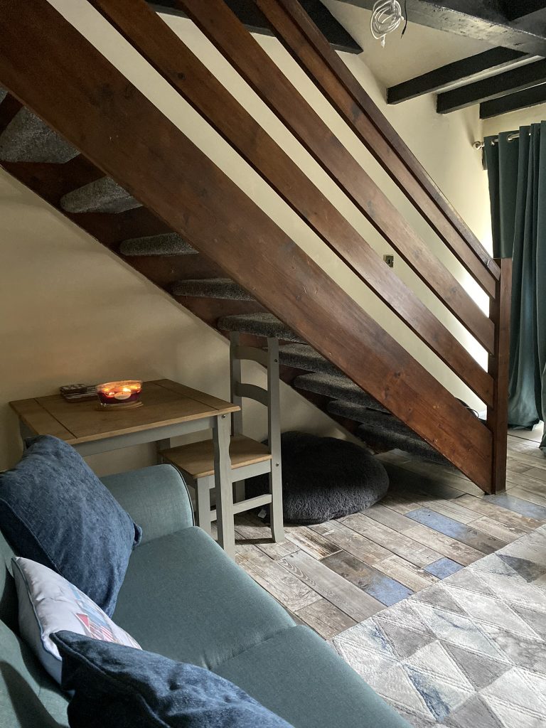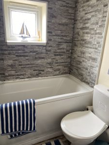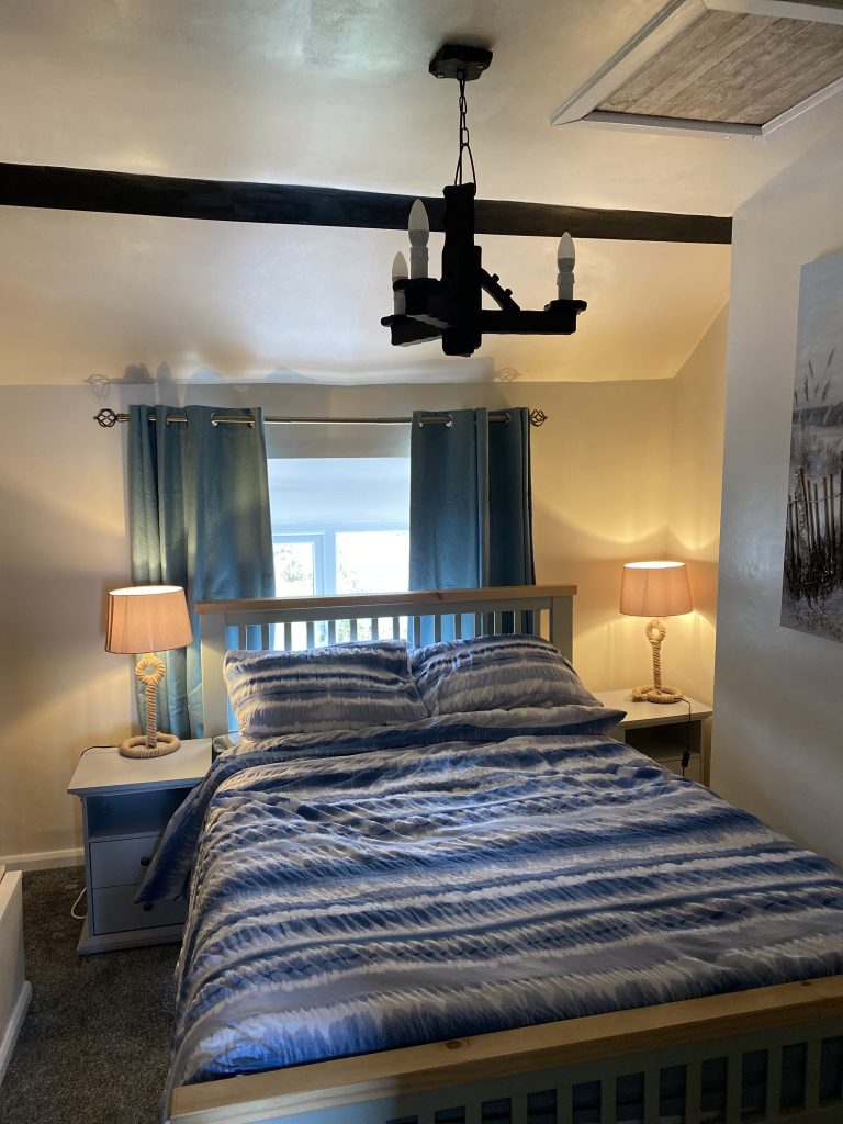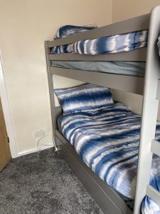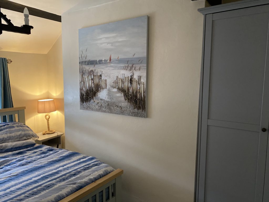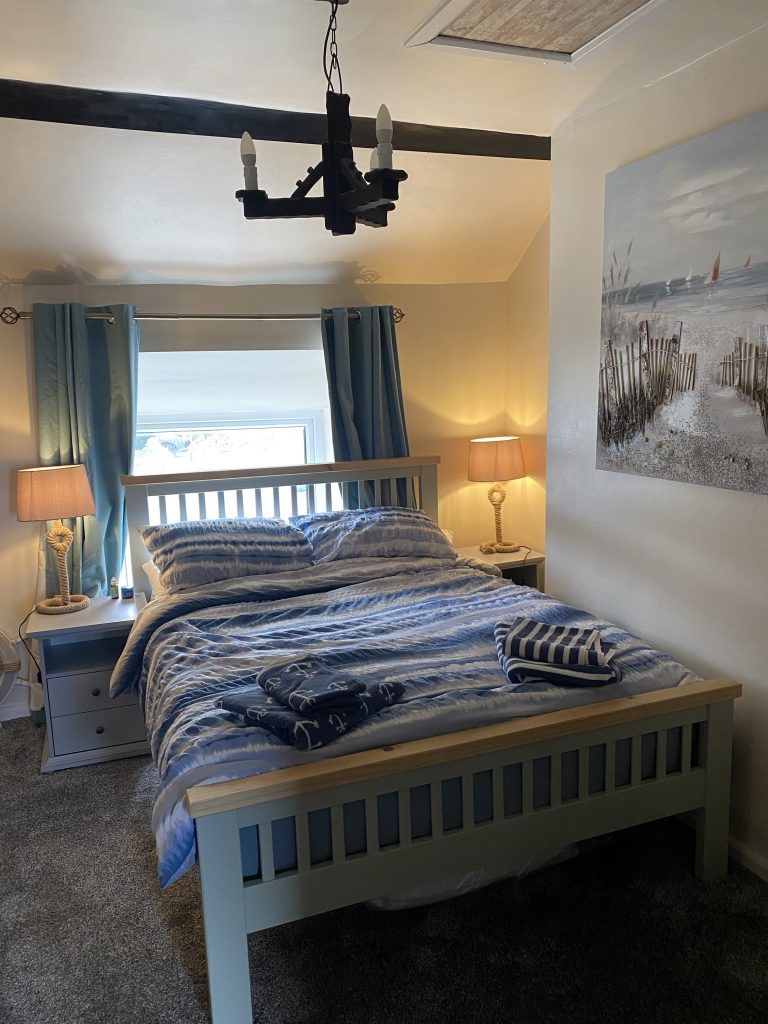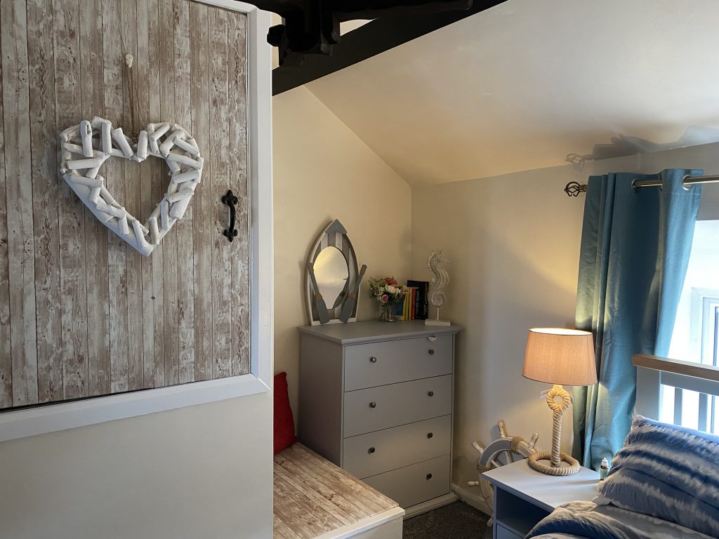A carpeted staircase brings you to the first floor, presenting you with the two pristine cottage style bedrooms, a fresh and comfortable double room in the front overlooking the front garden and views of the quarry. The rear bedroom with bunk bed has sea views.